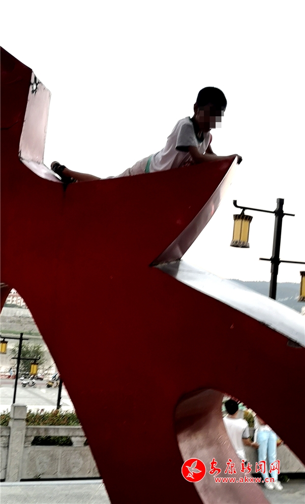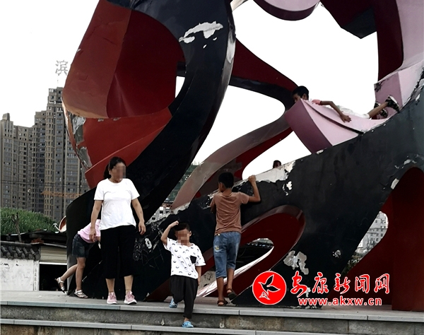 近日,記者在漢調二黃文化園看到,游玩的市民絡繹不絕,大部分市民都能做到文明游園,但其中也存在不文明行為。這里是文化園主題雕塑,幾個10歲左右的小男孩不斷攀爬雕塑,并在離地面約2米的高處逗留,現場既無工作人員勸導也沒有“禁止攀爬”的相關提示牌。記者 潘潤生 攝