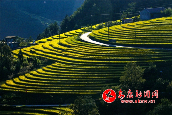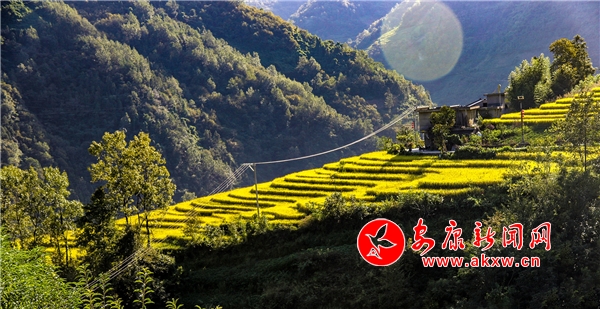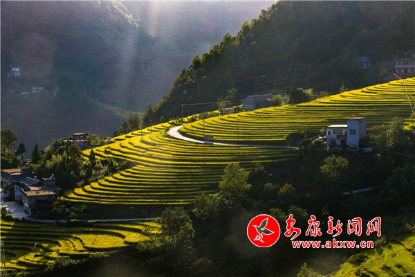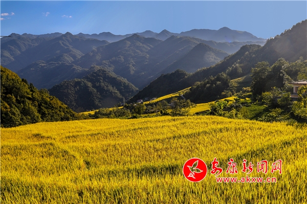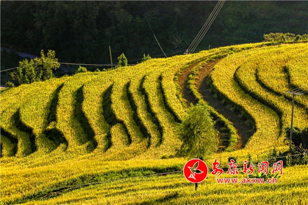 放眼望去,黃亮亮的稻谷,層層疊疊,從山底一直鋪到半山腰。水田都是依山而修,隨山形而變,高差均是隨坡放緩,形狀雖不十分規則卻也精巧,動人之處全在自然的水平線上。