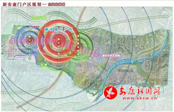 依據總體規劃,擬將安康高新區高新大道以西、北環快速干道以南、月河流域以北、寨河梁以東區域的60平方公里,規劃為新安康門戶區。在空間布局上,以高鐵安康西站為核心,以新時代大道、新安康大道、安康大道、創新路4條東西向城市主干道和高新大道、高新七路、高新十路、高新十二路、冉河西路、國賓大道6條南北向城市主干道為軸線,規劃布局新經濟引領區、臨空經濟區、新行政中心區、現代服務聚集區、安康特色產業區,以此打造“五大”門戶。