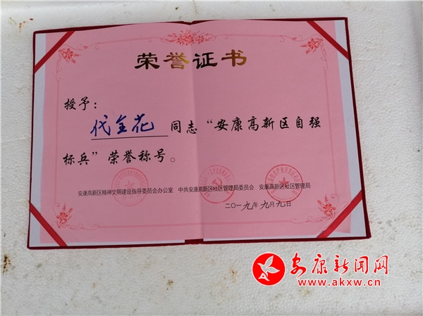 筆者從陳斌口中得知,2019年6月,代全花分別被安康高新區和五檔村黨支部、村委會授予“自強標兵”和“自主創業模范”榮譽稱號,去年一家成功實現了脫貧。?