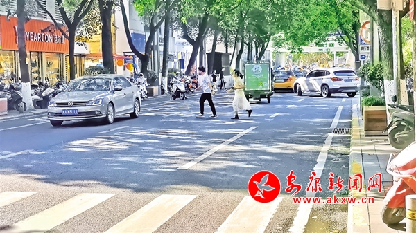 6月22日,安康中心城區金州南路,行人橫穿馬路,不走斑馬線。(記者 吳單 攝)