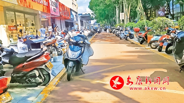 6月23日,金州南路東側,摩托車、電動車停放在公交港灣,存在安全隱患。(記者 吳單 攝)