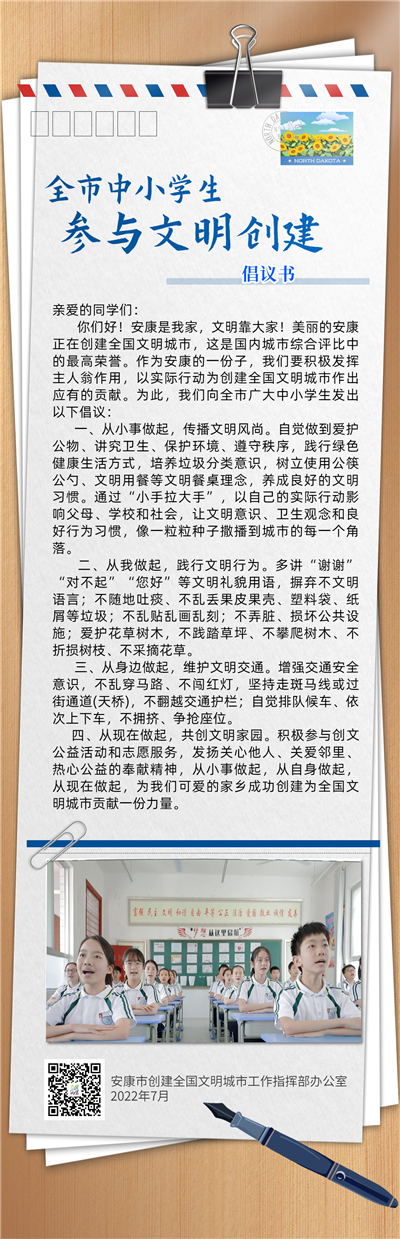 你們好!安康是我家,文明靠大家!美麗的安康正在創(chuàng)建全國文明城市,這是國內(nèi)城市綜合評比中的最高榮譽。作為安康的一份子,我們要積極發(fā)揮主人翁作用,以實際行動為創(chuàng)建全國文明城市作出應(yīng)有的貢獻。為此,我們向全市廣大中小學(xué)生發(fā)出以下倡議: