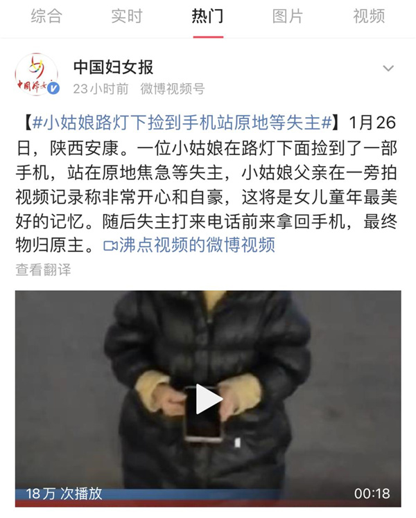 1月28日下午,#女孩撿手機站原地等失主##小姑娘路燈下?lián)斓绞謾C站原地等失主#話題沖上了抖音熱門、微博熱門,廣大網(wǎng)友紛紛點贊。