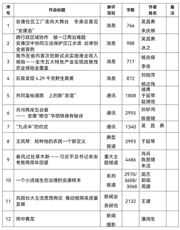 按照省記協要求,特將推薦參評2022年度陜西新聞獎初評的作品予以公示。公示期為2023年2月13日至2月17日,在此期間內如有異議請向新聞管理部反饋。報送作品如下:?