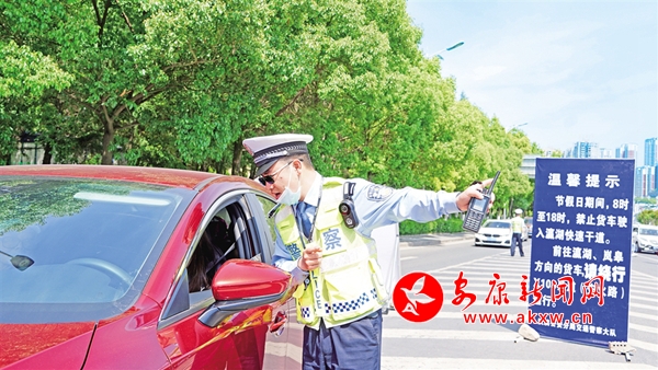5月1日,在瀛湖快速干道與三橋北交匯路口,漢濱交警大隊民警為游客介紹前往瀛湖景區情況。汪海玉 攝
