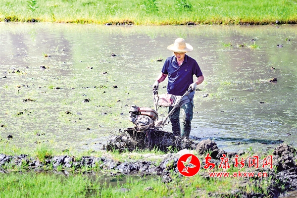 5月1日,石泉縣城關鎮絲銀壩村百畝水田里,農戶操作旋耕機做好插秧前的各項準備工作。董長松 攝