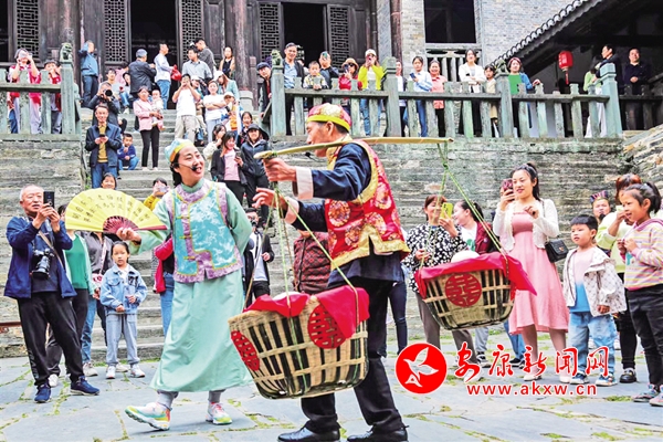 5月1日,旬陽市蜀河古鎮展示傳統民俗文化引來游人喝彩。李春江 攝