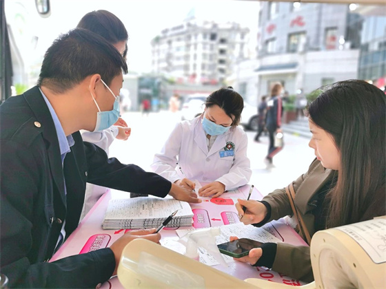 早上9點,列隊等候的醫務工作者們在獻血車前,井然有序的進行信息登記、健康征詢、血壓測量等程序。他們中有多次獻血的“老兵”,也有首次獻血的年輕職工,有的剛下夜班,有的趁工作間隙,還有的則放棄了休息趕來。大家紛紛表示,無償獻血就是以實際行動踐行廣大醫護人員的初心使命,為老百姓的生命健康保駕護航。