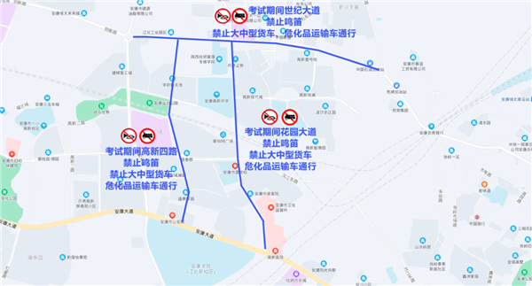 1、花園大道(安康大道至世紀大道)、世紀大道(新路口環島至五路口環島)、高新四路,所有通行車輛于6月6日21時至6月8日21時,無論遇到何種情況,一律禁止鳴笛,禁止大中型貨車、危化品運輸車通行。