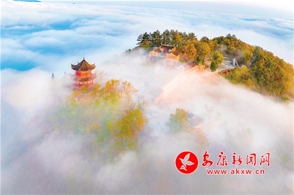 天柱山最美不過秋色,也是我在四季當中頻繁上山的季節。每逢秋天,這里紅黃綠相間,漫山掛彩,在藍天的映襯下,多了幾分浪漫。從國道211起點的兩條上山公路,由數個“之”字連接起來,從湖邊一直盤旋至山頂的白云古寺,遠眺仿佛一個大大的“人”字形飄帶。雨后放晴的頭兩個早晨,在云霧的籠罩下,天柱山的下半身連同湖面一并被巨大的“蠶絲被”覆蓋,山的上半身或山頭浮在云海之上,像是茫茫大海上的一座孤島。
