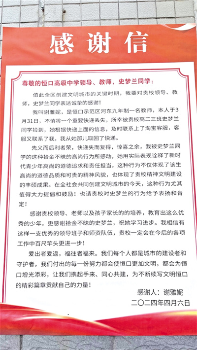 小城大愛,溫暖無處不在。近日,在恒口高級中學(xué),河?xùn)|九年制學(xué)校教師謝雅妮給該校學(xué)生史夢蘭送來了一封暖意融融的感謝信,向她拾金不昧的行為表示感謝,也為學(xué)校的德育工作點贊。