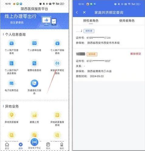 在“服務”菜單界面,點擊進入“家庭共濟綁定查詢”頁面,可以查詢授權者和使用者的角色信息。