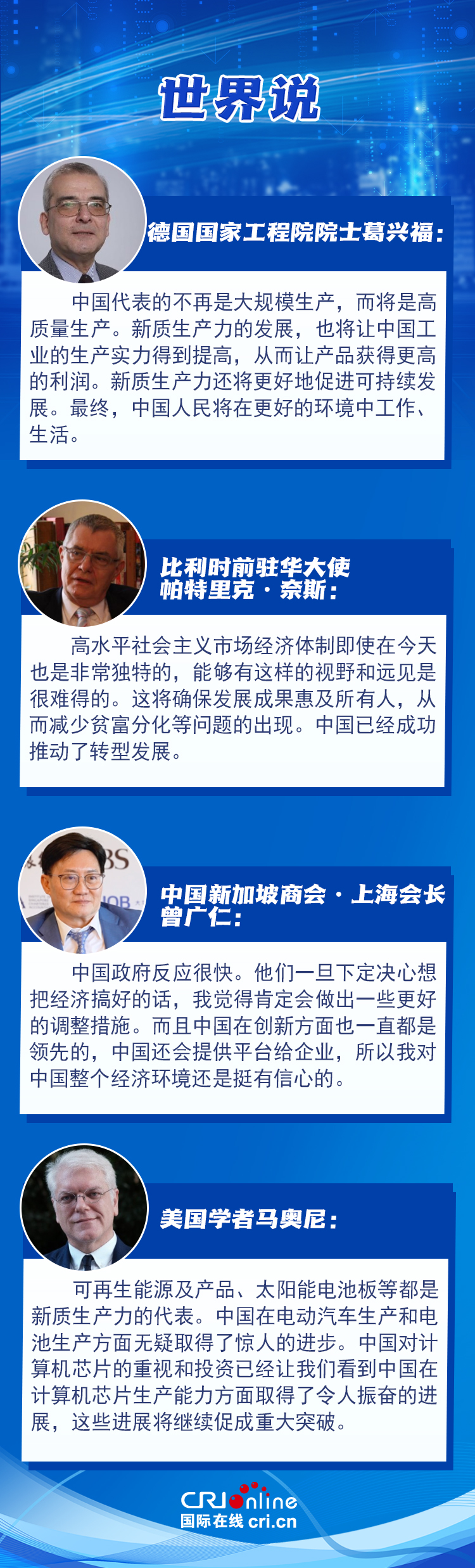 多位國際人士對中國經(jīng)濟發(fā)展充滿信心,高度肯定中國政府在經(jīng)濟發(fā)展中的核心引領(lǐng)作用,并對中國在高質(zhì)量生產(chǎn)及高精尖領(lǐng)域的創(chuàng)新領(lǐng)先地位表示贊賞。