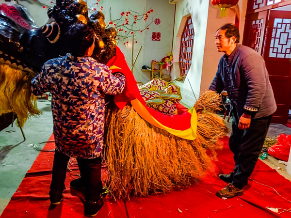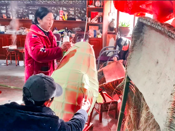 “龍頭是整條龍的重點(diǎn),刻畫(huà)要逼真,色彩還得鮮艷。忙碌了一年的鄉(xiāng)親們,就希望在正月里,抖擻精神,舞動(dòng)起來(lái)?!闭f(shuō)話間,李忠寶一雙巧手上下翻飛,正在修剪龍頭花燈的胡須,忙得額頭沁出了汗珠。兒子李石磊則忙著幫烤、粘、填、糊、上色……在他們父子倆的精雕細(xì)琢下,一個(gè)威風(fēng)凜凜、栩栩如生的花燈道具龍頭,總算扎制完成。