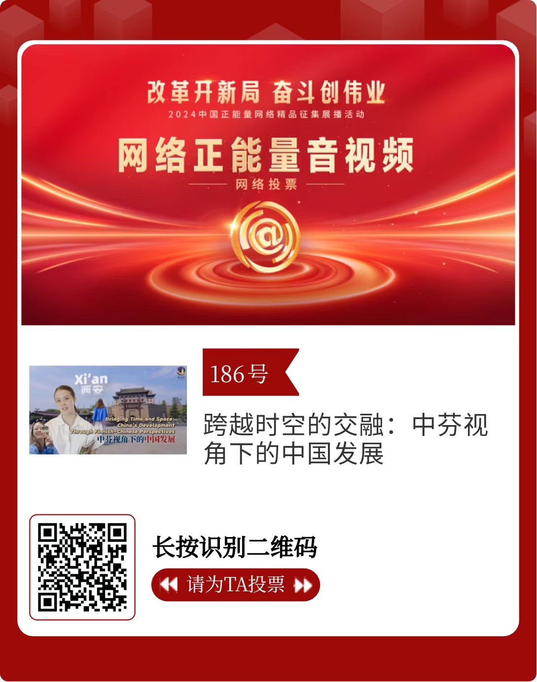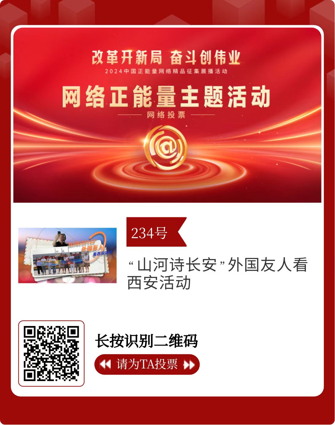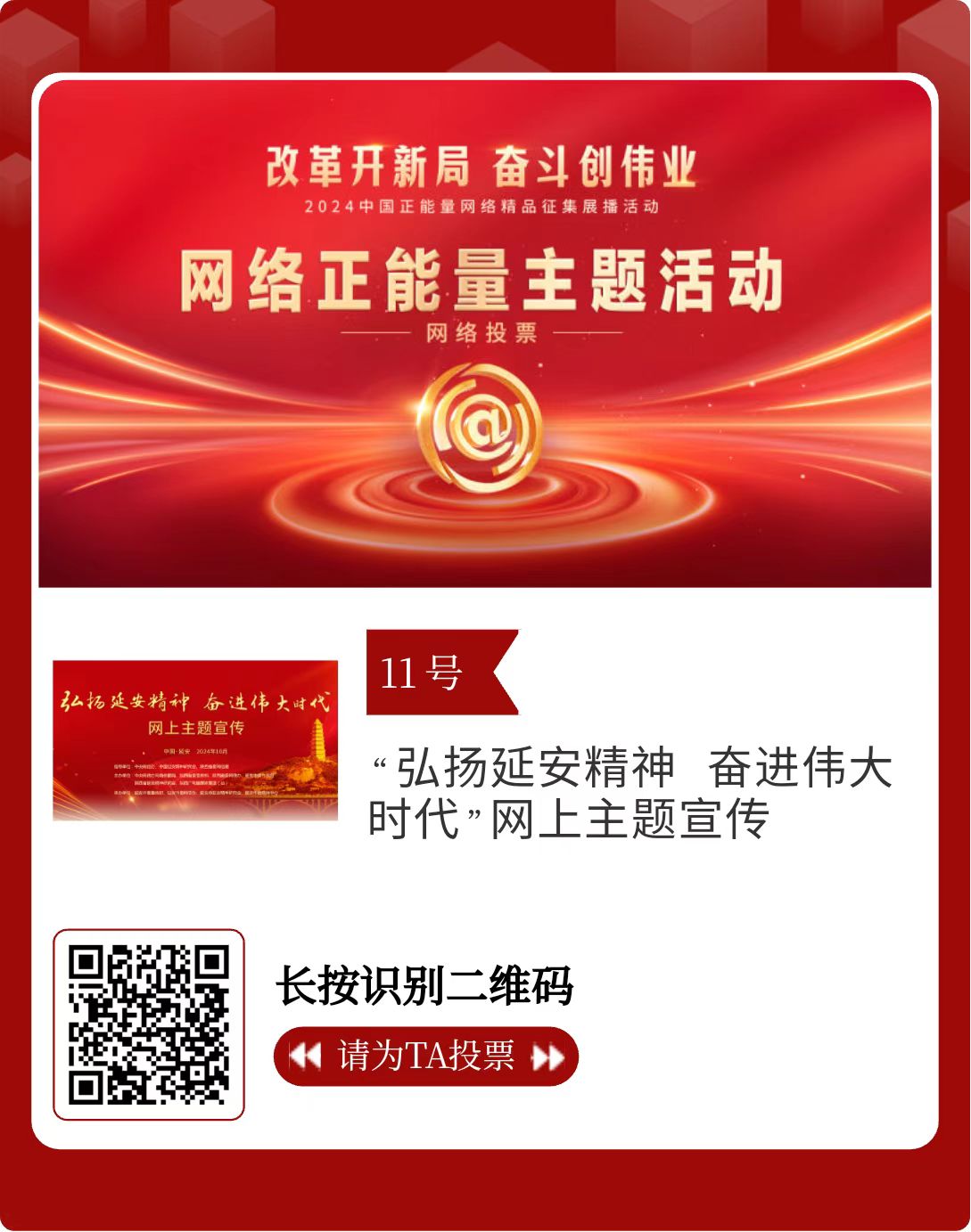 改革開新局,奮斗創(chuàng)偉業(yè)。由中央網(wǎng)信辦主辦的2024中國正能量網(wǎng)絡(luò)精品征集展播活動今天啟動網(wǎng)絡(luò)展播投票。