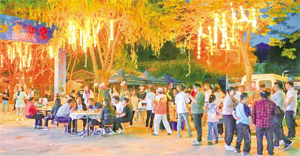 活動現場,本土樂隊、游客與特邀嘉賓輪番登臺,民謠、搖滾、電子樂交織回蕩。游客們圍著篝火載歌載舞,火光映紅張張笑臉。現場設置的文創產品和小龍蝦、燒烤等特色美食攤位更是滿足了游客的多重體驗。