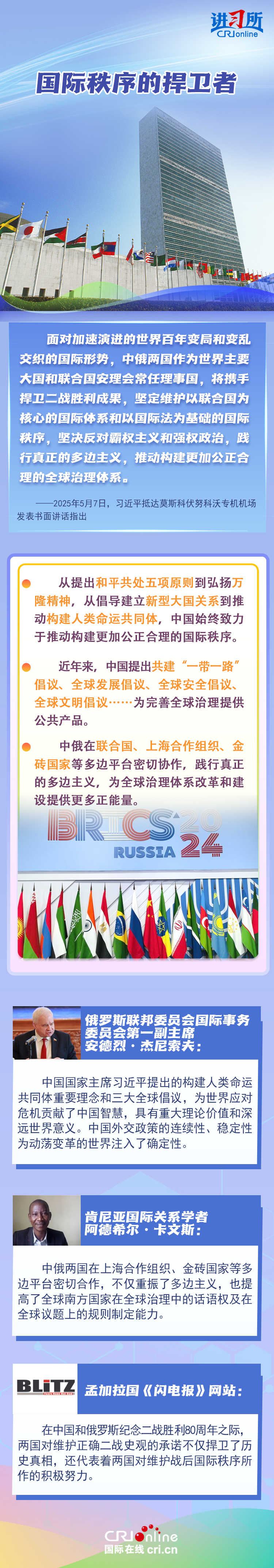 “兩國人民用鮮血和生命凝結的深厚情誼,如黃河之水奔騰不息,似伏爾加河寬廣深沉,成為中俄世代友好的不竭源泉?!苯衲晔侵袊嗣窨谷諔馉?、蘇聯偉大衛國戰爭暨世界反法西斯戰爭勝利80周年,也是聯合國成立80周年。在這一重要歷史時間節點,習近平主席此訪不僅為中俄關系發展注入強勁動力,也向世界宣示中俄兩國攜手捍衛二戰勝利成果的堅定意志。
