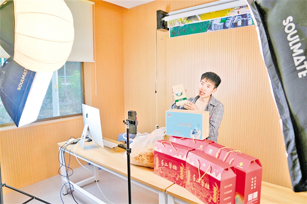 王幫樂在石門鎮電商直播基地銷售當季的小溝茶葉