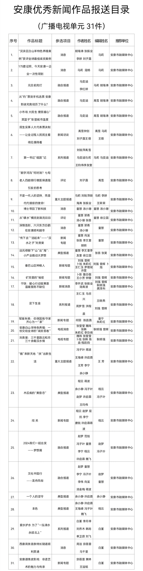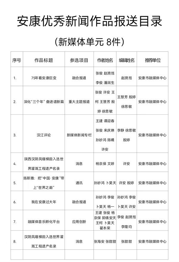 根據《關于開展2024年度安康優秀新聞作品、安康市優秀新聞工作者推選工作的通知》(安記協〔2025〕04號)文件要求,經推薦、領導審核,安康市融媒體中心推薦參評2024年度安康優秀新聞作品97件(報紙單元58件,廣播電視單元31件,新媒體單元8件)。現將報送作品目錄(詳見附件)予以公示。