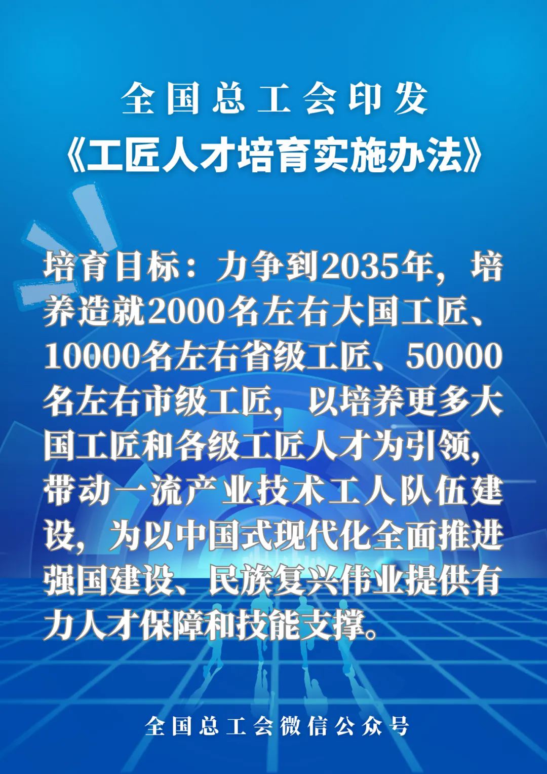 第二條 培育目標是,力爭到2035年,培養造就2000名左右大國工匠、10000名左右省級工匠、50000名左右市級工匠,以培養更多大國工匠和各級工匠人才為引領,帶動一流產業技術工人隊伍建設,為以中國式現代化全面推進強國建設、民族復興偉業提供有力人才保障和技能支撐。