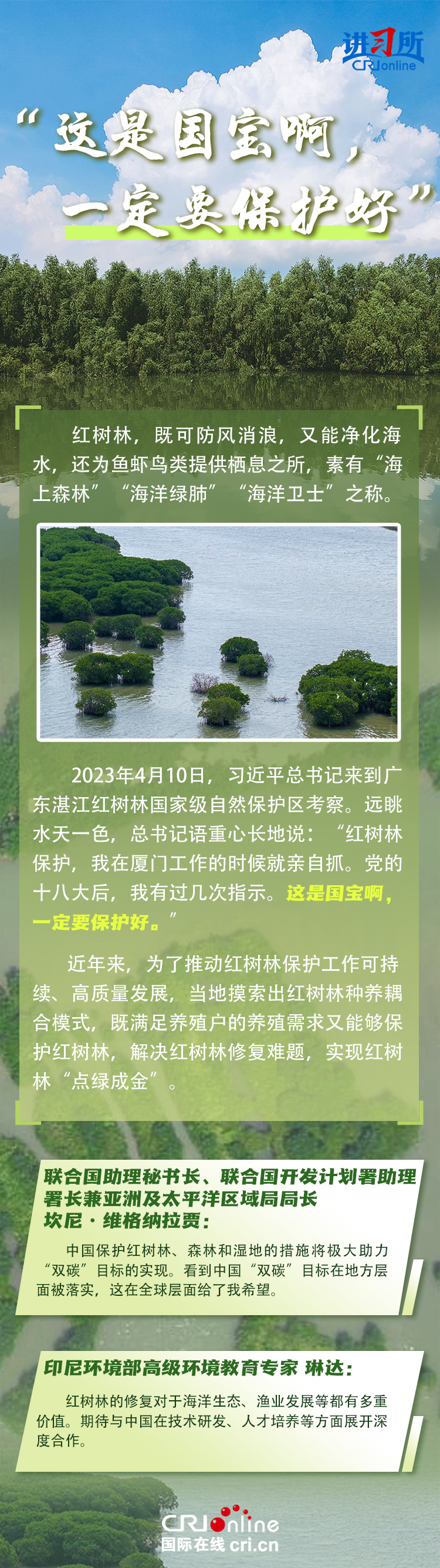 新時代以來,在習(xí)近平生態(tài)文明思想的科學(xué)指引下,“兩山”理念已深入人心,從“點綠成金”的紅樹林到一座座“花果山”,再到走向世界的長汀經(jīng)驗……美麗中國建設(shè)邁出重大步伐,生態(tài)環(huán)境保護發(fā)生歷史性變化。國際社會認(rèn)為,中國取得廣泛的綠色發(fā)展成就,從根本上源于習(xí)近平生態(tài)文明思想,特別是“兩山”理念的指引。在通過綠色轉(zhuǎn)型推動經(jīng)濟可持續(xù)發(fā)展方面,中國正成為全球可持續(xù)發(fā)展的典范。