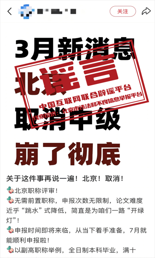 詳情:近期,2025年度職稱評審工作啟動后,網上流傳“北京取消中級職稱”的說法。經核實,此言論不實,中級職稱并未取消。據北京市人社局介紹,申報人可以對照初級、中級、高級職稱不同層級的要求,根據自身情況申請職稱評審。不同系列的職稱申報具體要求不同,以工程技術系列為例,本科畢業需要先取得中級職稱,獲評中級職稱后從事本專業技術工作滿5年,才能申報高級職稱。(來源:“北京網絡舉報”微信公眾號)