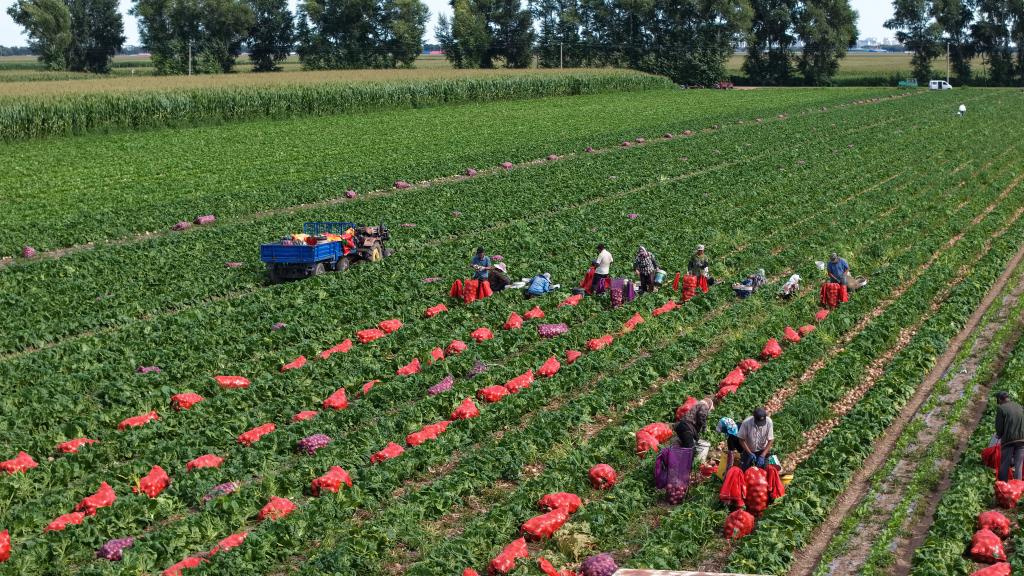 黑龍江省齊齊哈爾市梅里斯達斡爾族區雅爾塞鎮紅星村洋蔥種植基地洋蔥豐收。 新華社發(鄂洪波攝)