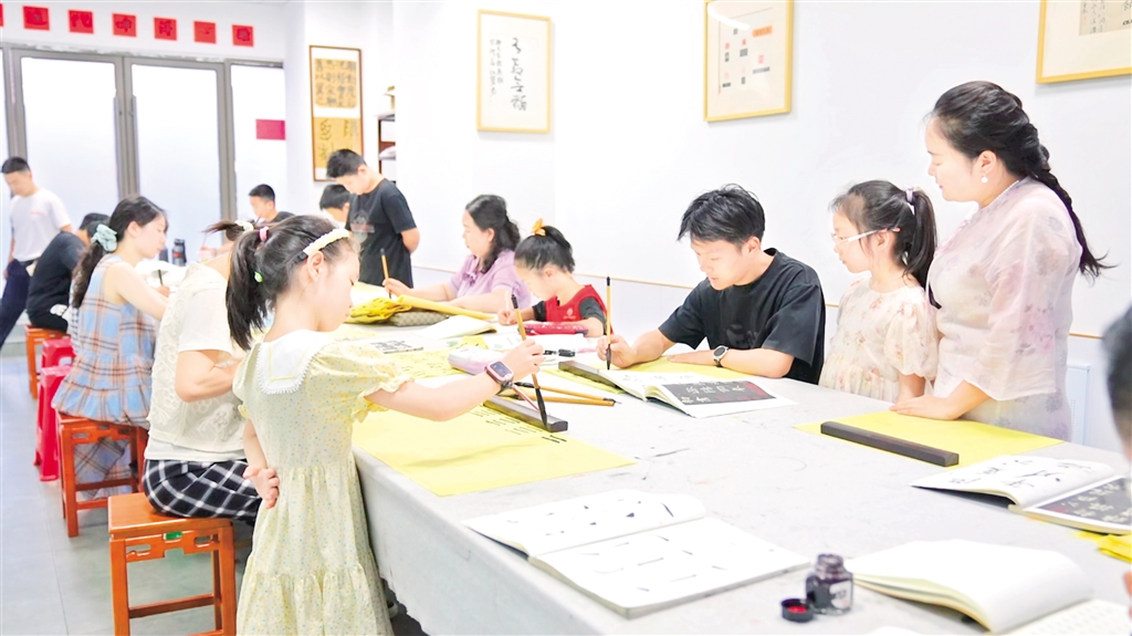 “我們來看下這‘?!?,是左右結(jié)構(gòu)的字,左邊的偏旁是一個三點(diǎn)水,三點(diǎn)水寫的時候要注意連貫性……”書法老師細(xì)致地拆解著漢字的書寫技巧,耐心指導(dǎo)著現(xiàn)場的每一位學(xué)員。