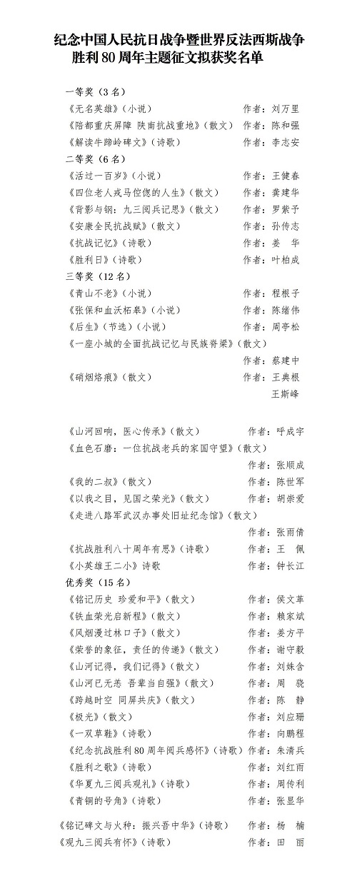 紀(jì)念中國(guó)人民抗日戰(zhàn)爭(zhēng)暨世界反法西斯戰(zhàn)爭(zhēng)勝利80周年主題征文評(píng)審結(jié)果公示