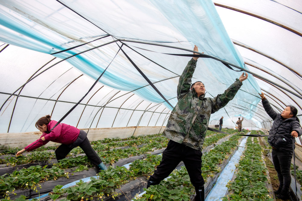 ??2023年12月15日,志愿者在浙江湖州長興縣水口鄉幫助農戶加蓋大棚保溫膜。為應對強雨雪天氣,志愿者們幫助農戶清理大棚上的積雪,加裝綁棚繩,棚內增設立柱,提高大棚抗風雪能力,確保農產品正常生產供應。