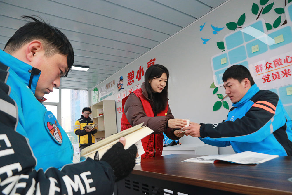 ??2023年12月27日,志愿者在山東省高密市密水街道“憩小亭”服務站為外賣騎手送上熱水。入冬以來,山東省高密市密水街道推進“憩小亭”暖心服務站建設,為外賣騎手、快遞小哥、網約車司機、環衛工人等戶外勞動者提供飲水、無線上網、食物加熱等多項服務,讓他們感受到冬日里的溫暖。