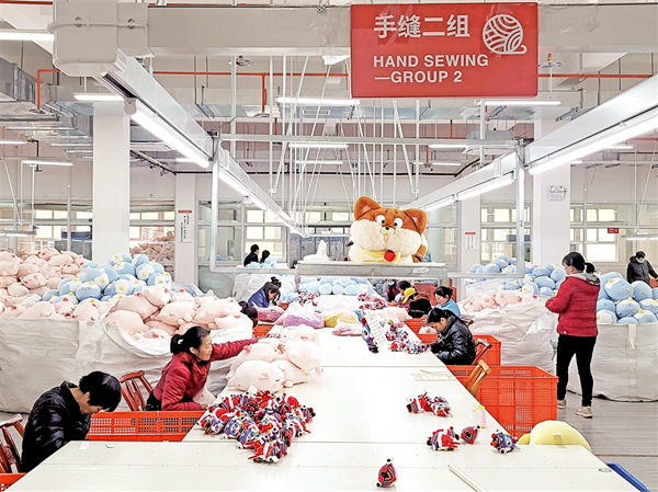 毛絨玩具生產(chǎn)車(chē)間里,女工們正在手工縫制