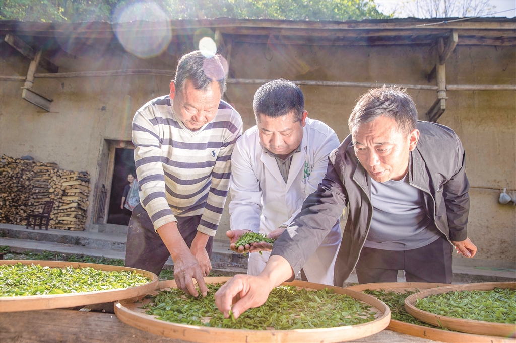 “十四五”期間,我市持續推進茶產業發展,努力實現茶產業“四時有收”。圖為紫陽白茶非遺制作技藝代表性傳承人在高橋鎮裴壩村,向茶農推廣紫陽白茶非遺制作技藝。