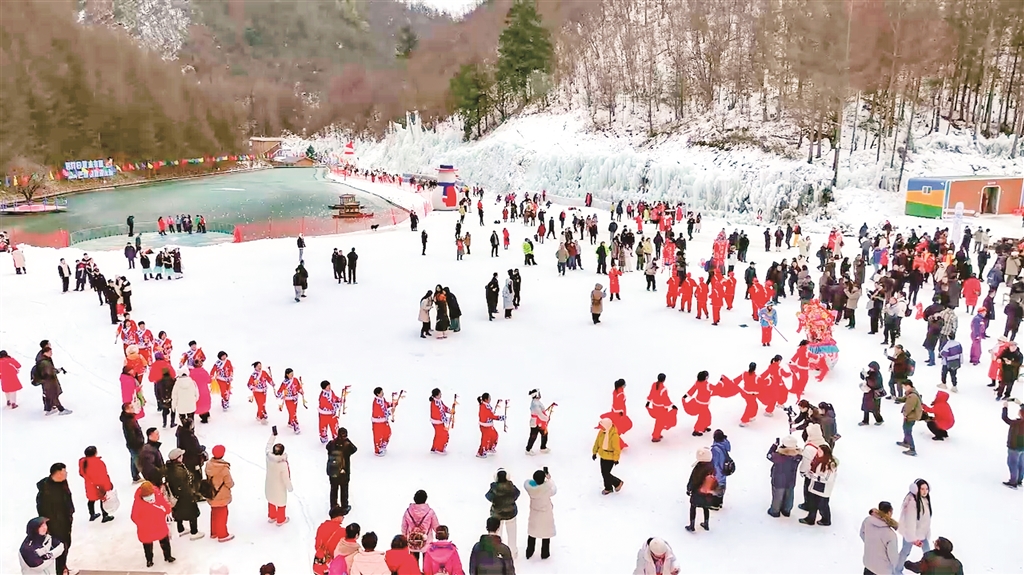 元旦期間,平利縣以“冬賞雪·趣平利”為主題,創新推出冰雪文旅融合系列活動,打造集觀賞、體驗、美食于一體的冰雪樂園。圖為1月2日,游客在平利縣八仙鎮天書峽景區游玩。 沈奕君 攝