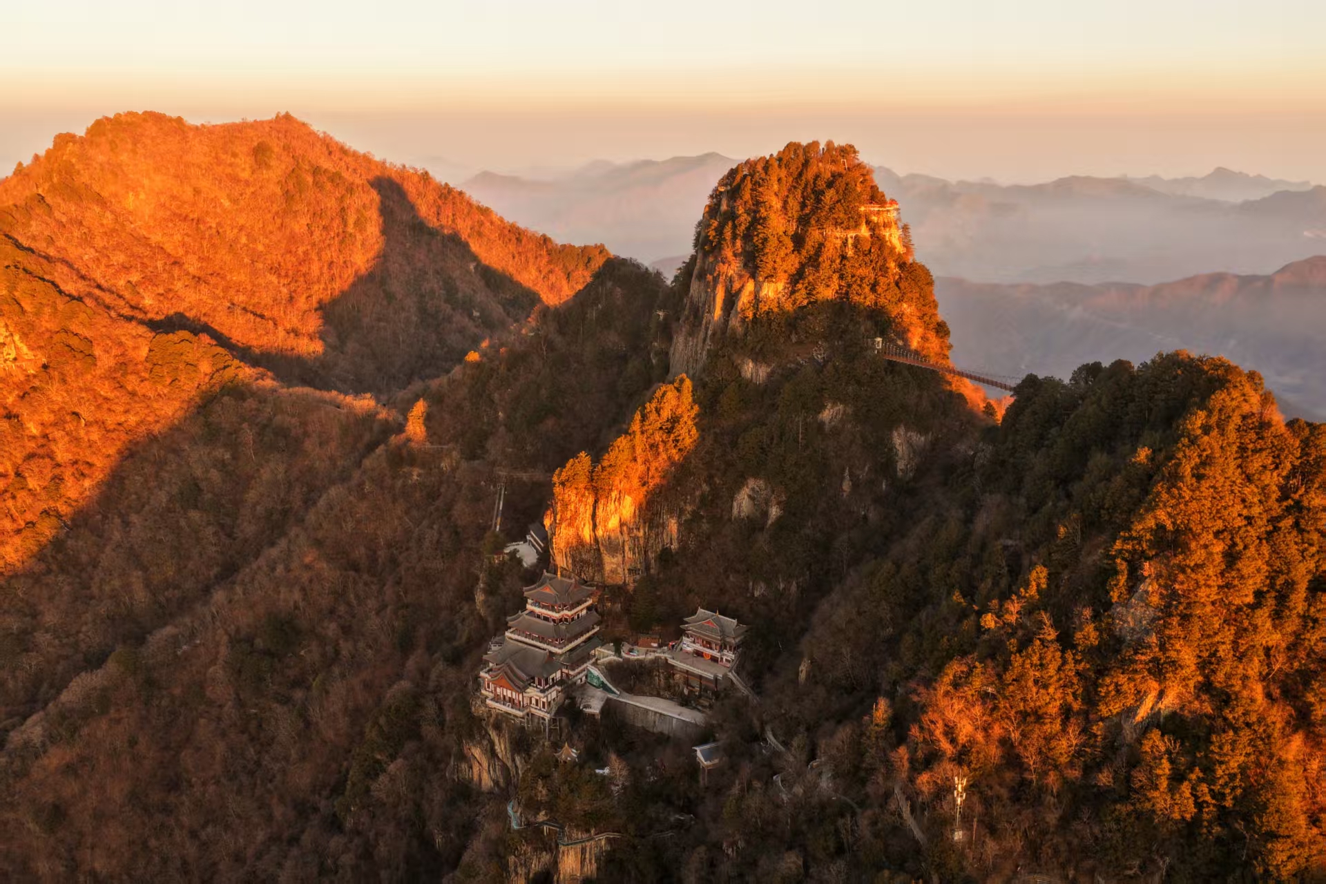 冬日清晨,登高俯瞰嵐皋縣南宮山景區,群峰籠罩于晨霧之中。朝陽映照下,連綿山體泛起赤紅光暈,盡顯地質景觀的雄渾壯闊。