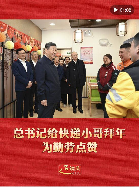 10日上午,習近平總書記在北京考察調研,走進西城區新街口街道父母食堂,見到在這里休息的快遞小哥,關切詢問他們的工作和生活,為他們付出的辛勞和作出的貢獻點贊,并給他們拜年。