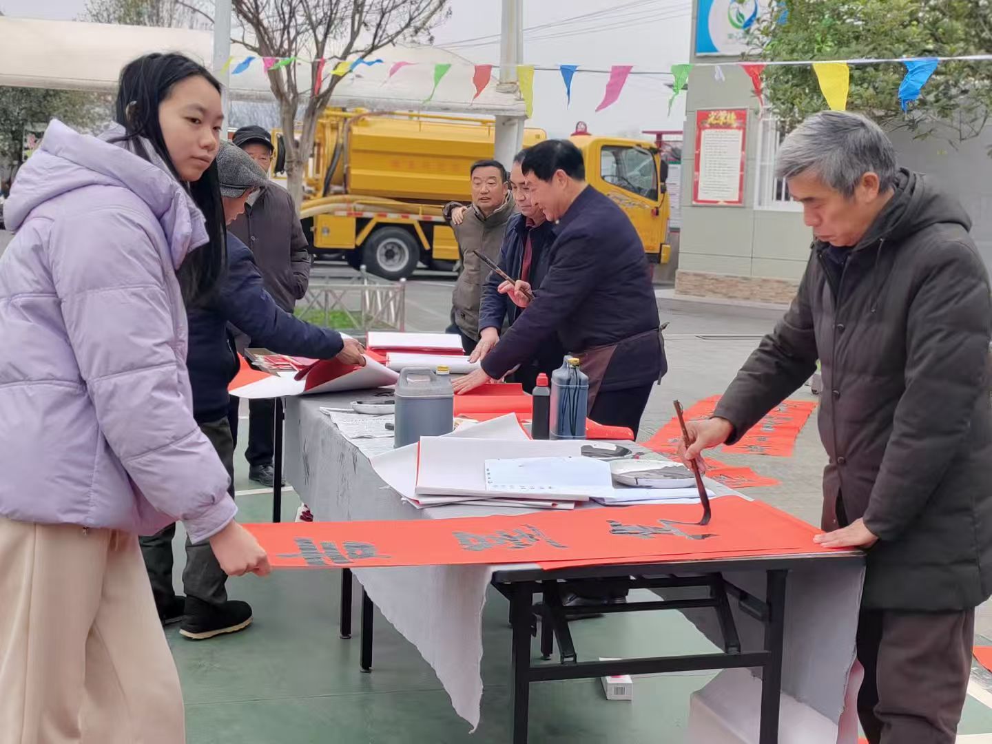 “村晚”現場還設置了新春惠民服務區,成為一道溫暖的風景線。鎮文化站邀請本土書法家現場揮毫潑墨,免費為村民書寫春聯和福字,墨香四溢,紅紙映春,村民們有序排隊領取,把新春祝福帶回家。鄉村年貨展銷區人氣高漲,漢陰富硒糧油、土蜂蜜、臘肉、豆腐干等特色農產品整齊擺放,駐村第一書記、村“兩委”干部化身“推銷員”,熱情推介本土好物,既方便村民置辦年貨,又拓寬農產品銷售渠道,讓“村晚”既有文化味,更有煙火氣與增收實效。