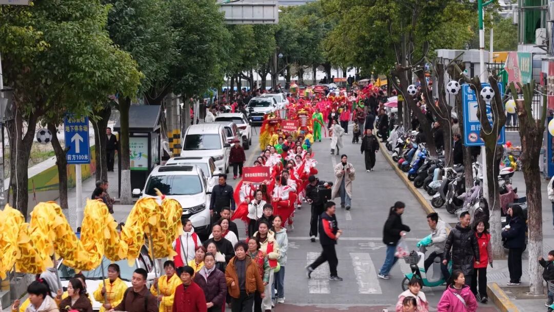 在主會場定點展演環節,各支隊伍各顯神通。率先登場的威風鑼鼓隊由老中青三代村民組成,整齊劃一的動作、雄渾震撼的節奏,敲出了鄉村振興的精氣神。彩獅隊則展現了半個多世紀的傳承堅守,這支成立于1972年的隊伍,隊員年齡跨度橫跨四代,紅綢舞動間,雄獅騰躍翻滾,贏得陣陣叫好。