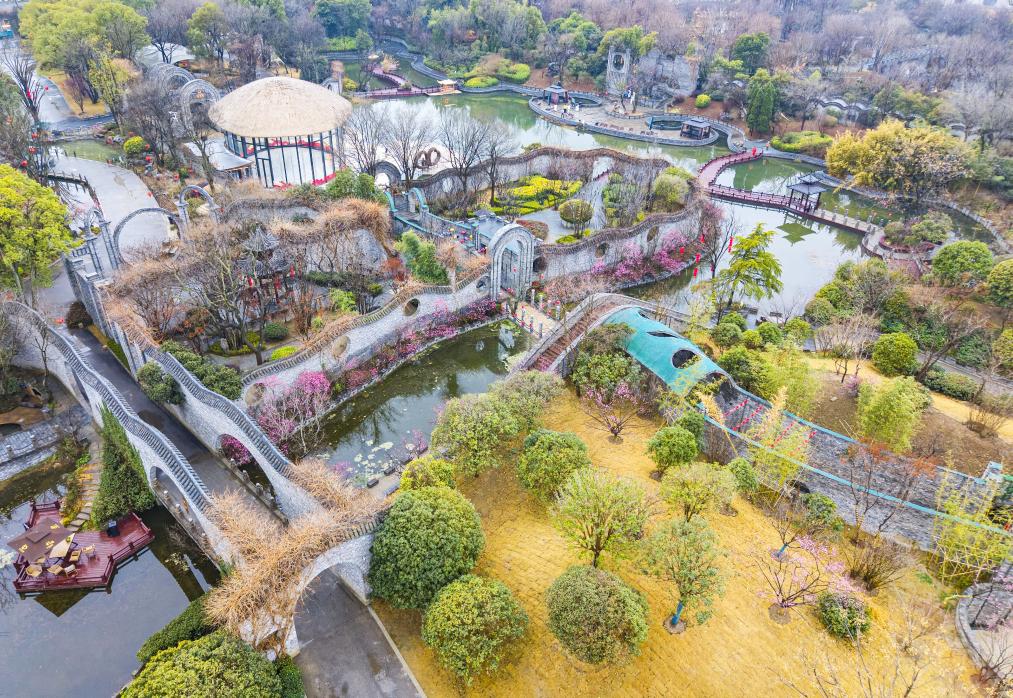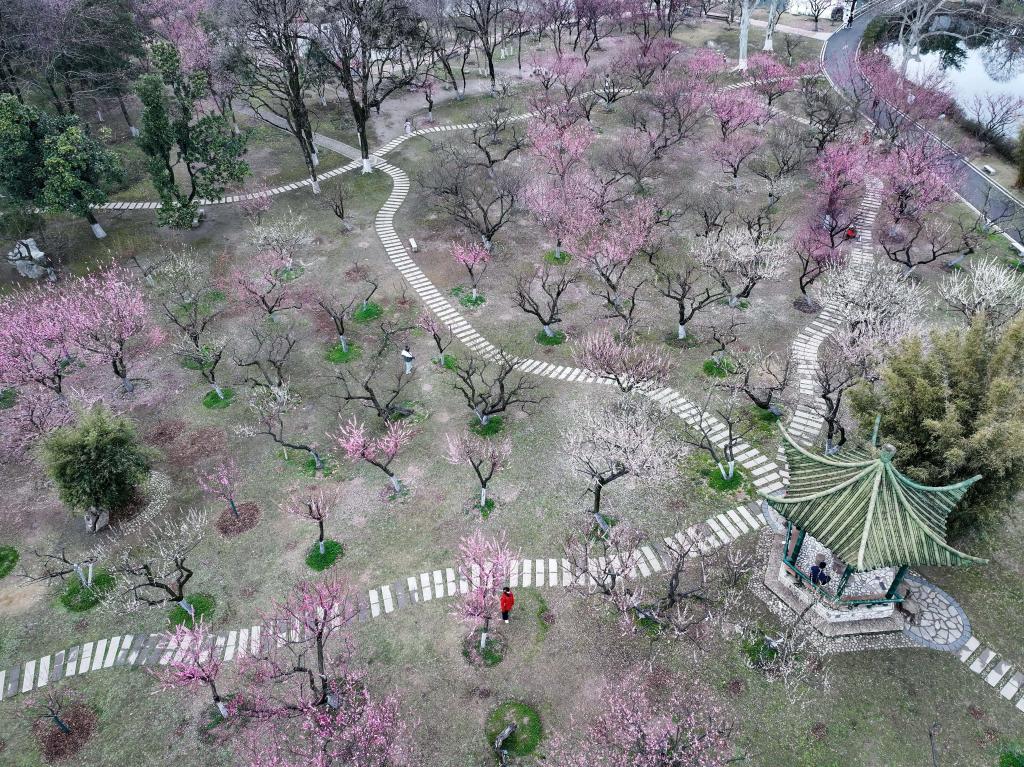 近日,游客在湖北省武漢市青山公園賞花游玩(無人機照片)。新華社發(趙軍攝)