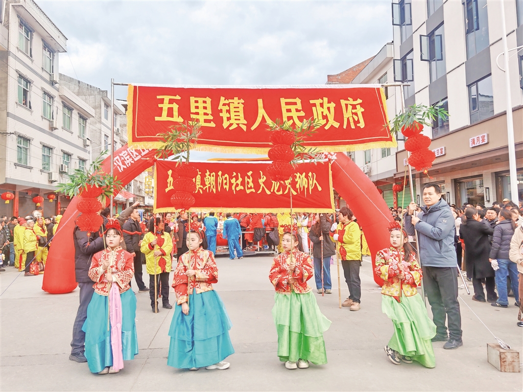 展演結(jié)束后,火龍、火獅和采蓮船等展演隊伍也被五里工業(yè)集中區(qū)企業(yè)邀請進行表演。在鏗鏘鑼鼓聲中,歡騰民俗在現(xiàn)代化廠區(qū)生動呈現(xiàn),職工們駐足觀看、掌聲不斷,處處洋溢著喜慶祥和、昂揚向上的濃厚氛圍。