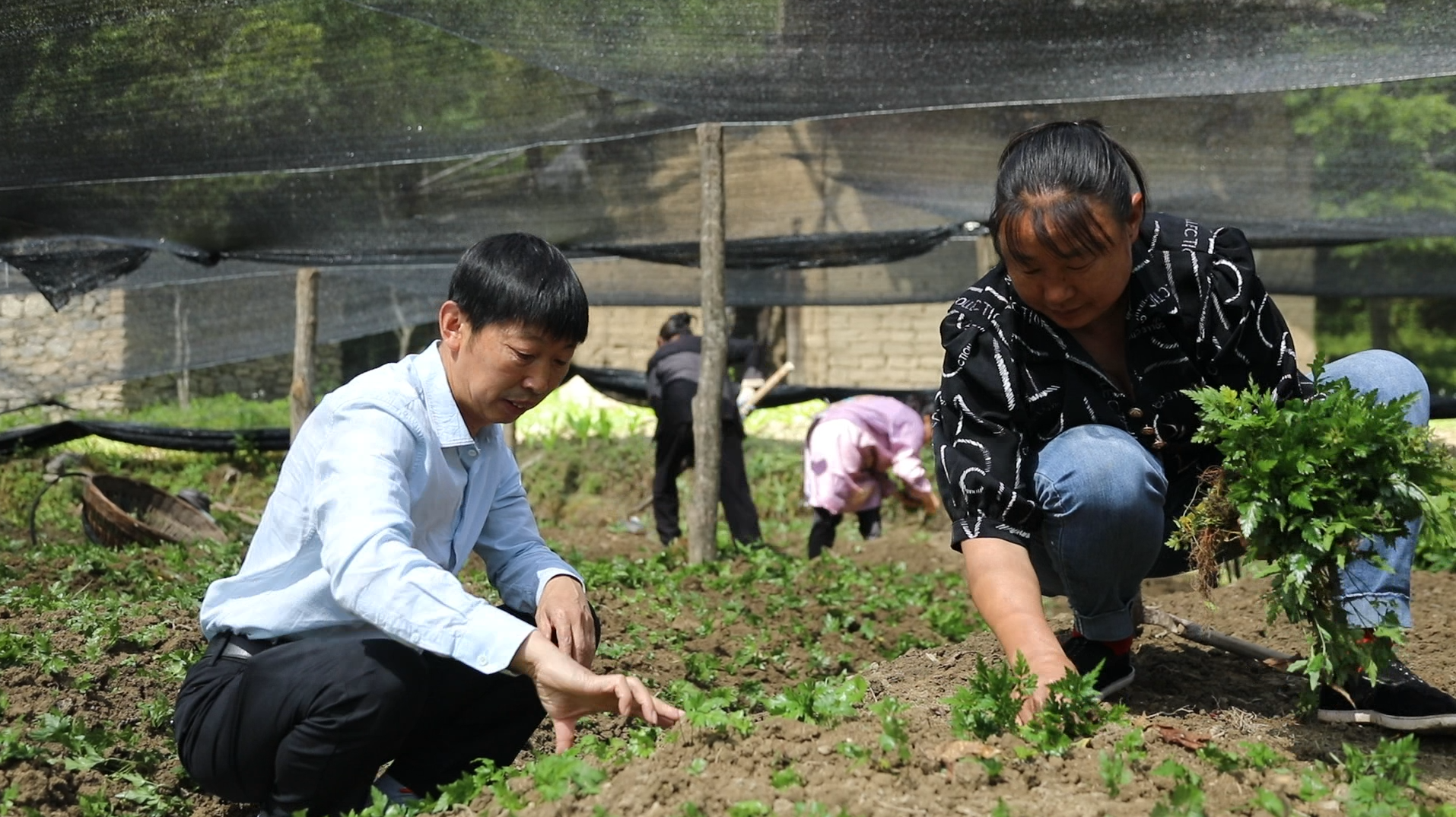 胡榜文(左)在黃連基地指導黃連種植。 屈光波 攝