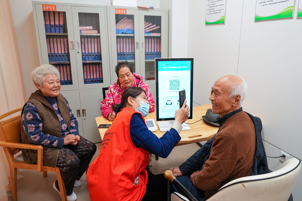 2025年10月23日,老人在山東省淄博市張店區馬尚街道金石社區日間護理中心測量健康數據。新華社記者 朱崢 攝