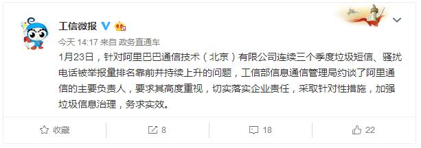 人民網(wǎng)北京1月24日電 據(jù)工業(yè)和信息化部信息中心官微@工信微報消息,昨日,針對阿里巴巴通信技術(shù)(北京)有限公司連續(xù)三個季度垃圾短信、騷擾電話被舉報量排名靠前并持續(xù)上升的問題,工信部信息通信管理局約談了阿里通信的主要負責人,要求其高度重視,切實落實企業(yè)責任,采取針對性措施,加強垃圾信息治理,務(wù)求實效。(朱江)LQm安康新聞網(wǎng)