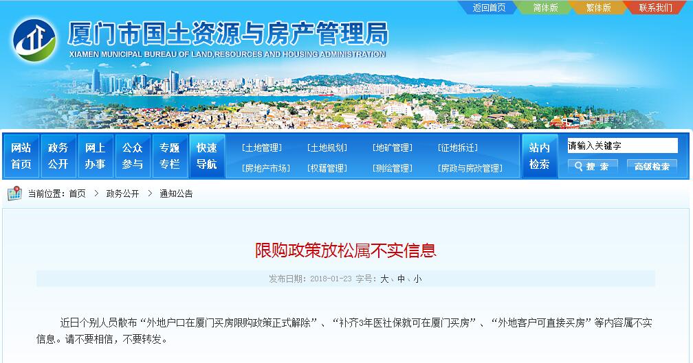 人民網北京1月24日電 據福建省廈門市國土資源與房產管理局官方網站消息,近日個別人員散布“外地戶口在廈門買房限購政策正式解除”、“補齊3年醫社保就可在廈門買房”、“外地客戶可直接買房”等內容屬不實信息。ZmY安康新聞網
