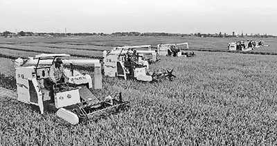 江蘇省興化市國家糧食生產功能區智慧農業服務中心糧食產業園收割水稻的繁忙景象。湯德宏攝/光明圖片qTc安康新聞網
