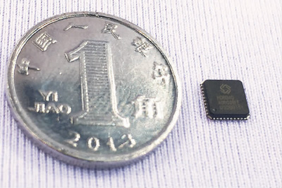 2017年9月16日,全球首個支持新一代北斗三號信號體制的高精度導航定位芯片正式發布。圖為支持新一代北斗三號信號體制的高精度導航定位芯片與1角硬幣的對比照片。kpF安康新聞網