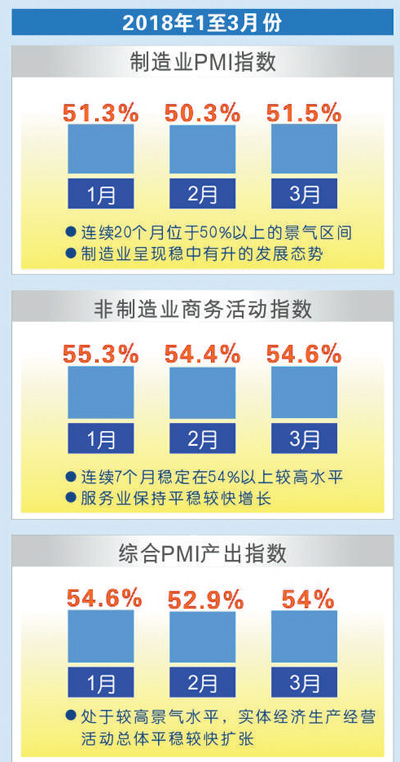 今年以來,面對錯綜復雜的國際國內環境,各地區各部門認真貫徹黨中央決策部署,堅持穩中求進工作總基調,不斷深化改革開放,有效激發內生動力和活力。從作為先行指標的1—3月份采購經理指數看,中國經濟延續了去年以來穩中向好發展態勢,發展預期穩定向好。