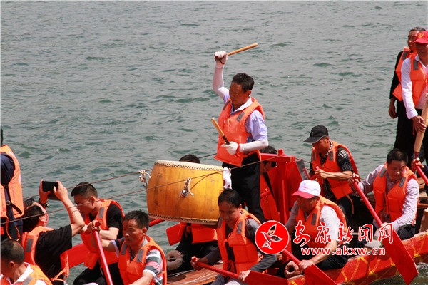 上午10時許,龍舟文化園禮炮轟鳴,數百健兒痛快地飲下“摔碗酒”,隨后依次登上自己隊伍的龍舟。紅色、黃色、紫色的龍舟整齊劃一地停靠在江邊,龍頭高昂,龍尾高翹,槳櫓浮動,旗幟飄揚。聞聲而來的群眾齊聚兩岸,駐足圍觀。總指揮一聲哨響,木槳齊動,龍舟似箭掠過無垠江面直逼江心,留下層層白浪;一艘艘或逆流勇進,或順流而下,或徑直橫渡,瞬間點燃觀眾激情,不時引得大家齊聲吶喊。號子聲、鑼鼓聲、吶喊聲、歡呼聲,此起彼伏,聲聲震天。隊員們跟隨著鼓點賣力地劃槳,舵手隨著龍舟行進的方向不停調整把舵,龍舟的速度不斷加快,再快,更快。
