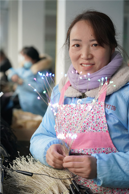 在安康市白河縣城關(guān)鎮(zhèn)安坪社區(qū)一家燈飾社區(qū)工廠內(nèi),工人馬友梅在展示制作的產(chǎn)品(2月22日攝)。新華社記者邵瑞攝